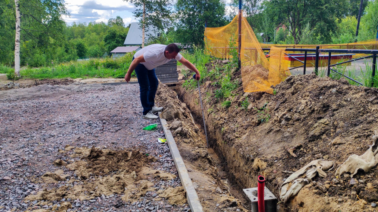 На фото изображён мужчина в белой футболке и джинсах, производящий замер глубины траншеи с помощью рулетки. Траншея проходит вдоль насыпи, в ней установлены красные гофрированные трубы для кабелей. По бокам расположены земляные валы, на заднем плане видны оранжевые строительные сетки и ограждения. Снимок отражает процесс контроля качества при прокладке инженерных коммуникаций. Фотография может быть использована для тематики строительства, строительного надзора и инженерных систем.