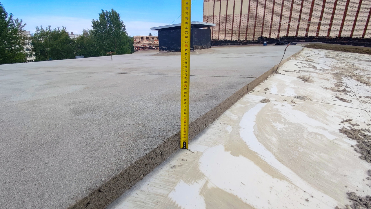 На фото изображён процесс замера толщины уложенной цементной стяжки на крыше. Желтая рулетка показывает около 18 сантиметров. На фоне заметны вентиляционные шахты и часть кирпичного фасада. Снимок фиксирует этап контроля качества и строительные процессы, связанные с ремонтом кровли, может использоваться в публикациях о технологиях утепления и техническом обслуживании зданий.