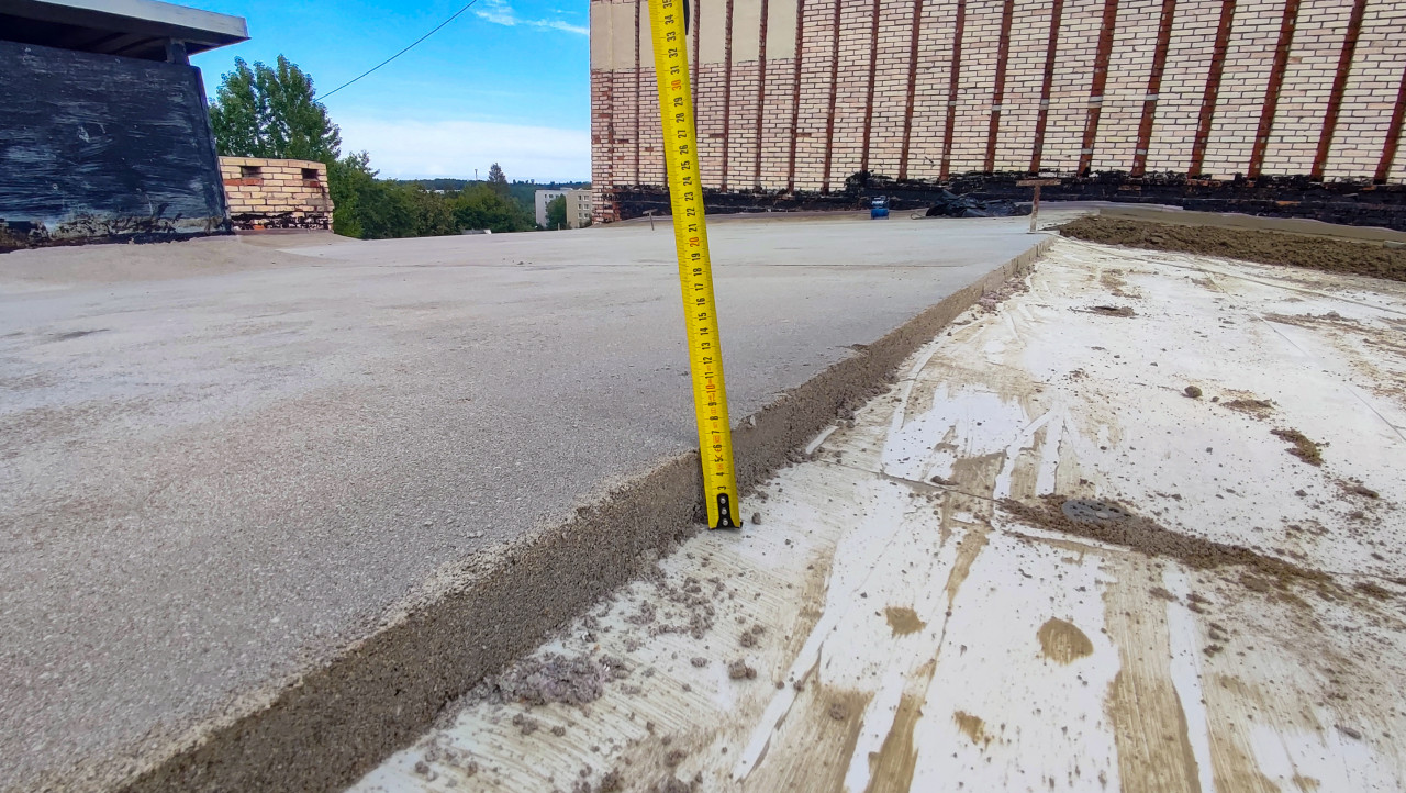 На фото показан крупный план замера цементной стяжки, выполненной на крыше здания. Желтая рулетка фиксирует слой примерно 15 сантиметров. На фоне видна поверхность кровли и часть кирпичной стены. Снимок демонстрирует контроль качества строительных работ и этап ремонта крыши, может использоваться для статей о строительных технологиях и техническом обслуживании зданий.