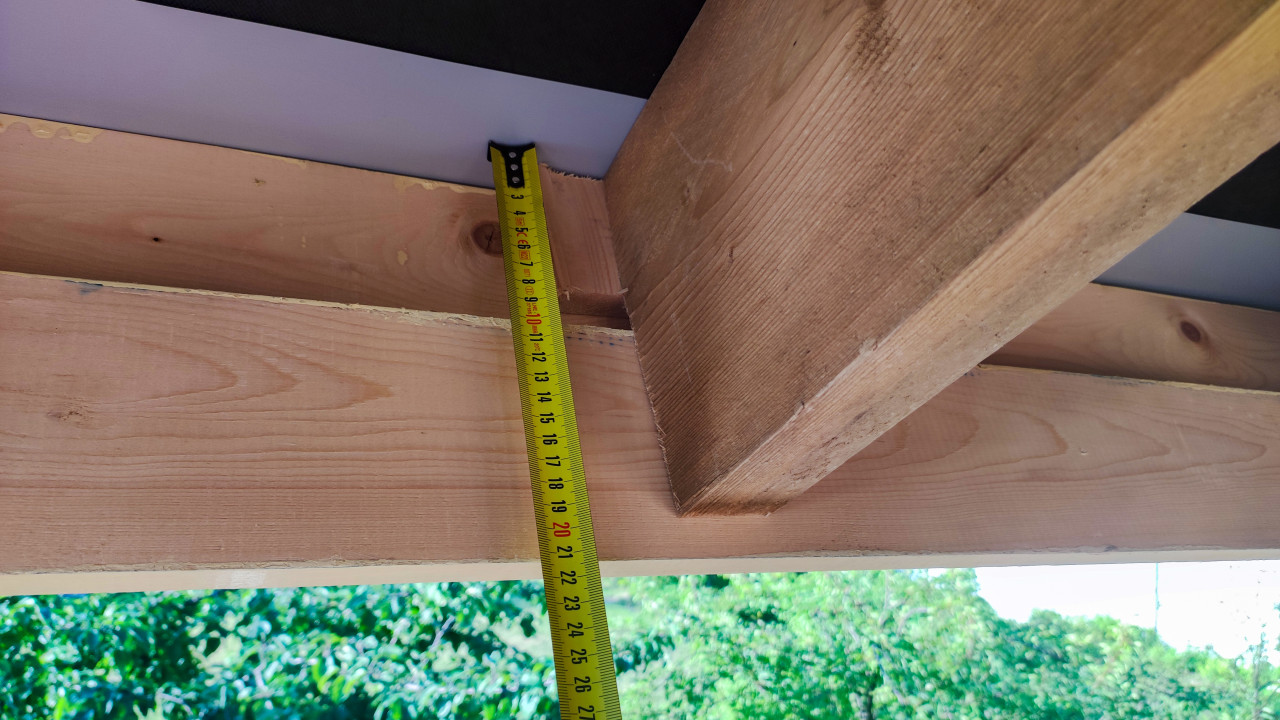На фото изображен процесс замера высоты между горизонтальной балкой и гидроизоляционным слоем крыши. В кадре виден строительный инструмент — рулетка, закрепленная у стыка балки и стропила, показывающая значение около 20 см. Конструкция выполнена из светлого дерева, а на заднем плане заметна зелень участка. Фото подходит для иллюстрации строительных технологий, этапов возведения крыши и монтажных работ.