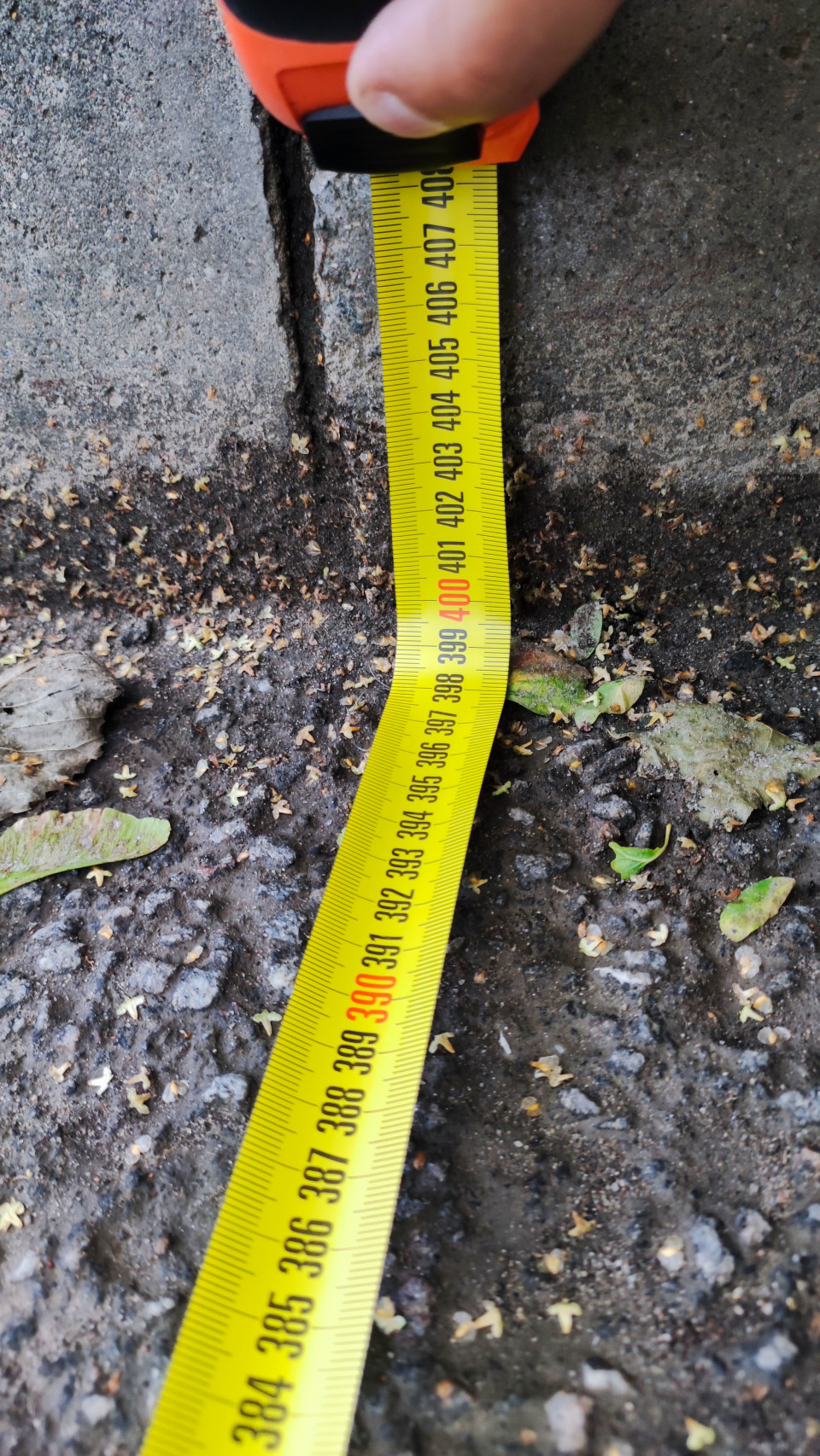 На фото запечатлён процесс измерения ширины проезжей части с использованием строительной рулетки. Жёлтая лента рулетки натянута вдоль асфальтового покрытия у бордюра, и на ней отчётливо видна отметка 400 см. В кадре присутствует рука человека, фиксирующего инструмент, а также поверхность дороги с мелкими листьями и частицами мусора. Снимок сделан крупным планом, акцентируя внимание на процессе фиксации ширины участка. Культурных или исторических объектов на фото нет. Изображение может быть использовано для материалов о строительных и дорожных замерах, проектировании и контроле параметров городской инфраструктуры.