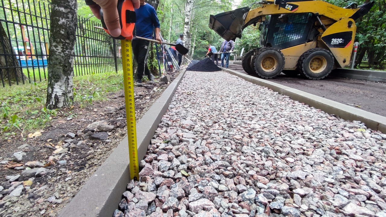 Фотография показывает процесс измерения высоты слоя щебня на участке дороги, подготовленном к асфальтированию. В кадре видна рулетка, установленная на бордюре, рядом рабочие с инструментами, а также спецтехника. Слева за кадром тянется металлический забор, за которым видна зелёная зона. На заднем плане — рабочие в спецодежде, занятые укладкой асфальтового покрытия. Сцена может использоваться для иллюстрации технического контроля дорожных работ и этапов благоустройства территории.