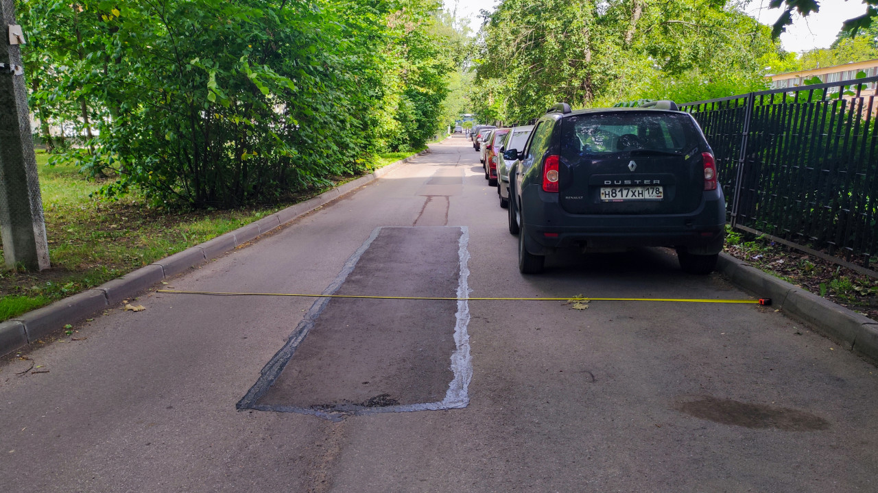 Фотография показывает процесс измерения ширины асфальтированной дороги с помощью строительной рулетки, натянутой от одного бордюра к другому. Вдоль обочины припаркован автомобиль Renault Duster, а на проезжей части видна прямоугольная заплатка после ремонта покрытия. Дорогу окружают зелёные насаждения и металлический забор. Культурно-исторических объектов в кадре нет. Снимок может быть использован для иллюстрации замеров дорожных проездов, ремонта дорог и благоустройства городской среды.