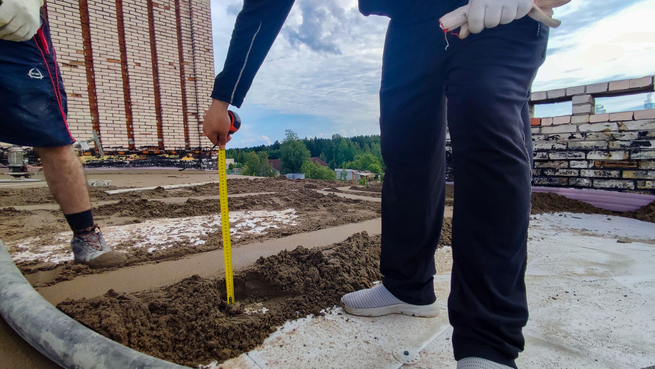 На фотографии запечатлен момент измерения толщины свежеуложенной цементной стяжки на крыше здания. Рабочий в перчатках держит рулетку, опуская её в слой раствора, чтобы зафиксировать показатель. На заднем плане видны кирпичная стена верхнего уровня здания и зелёные деревья, указывающие на открытую площадку. Снимок отражает этап контроля качества при выполнении кровельных работ и может использоваться в материалах о строительстве, ремонте и соблюдении технологий.