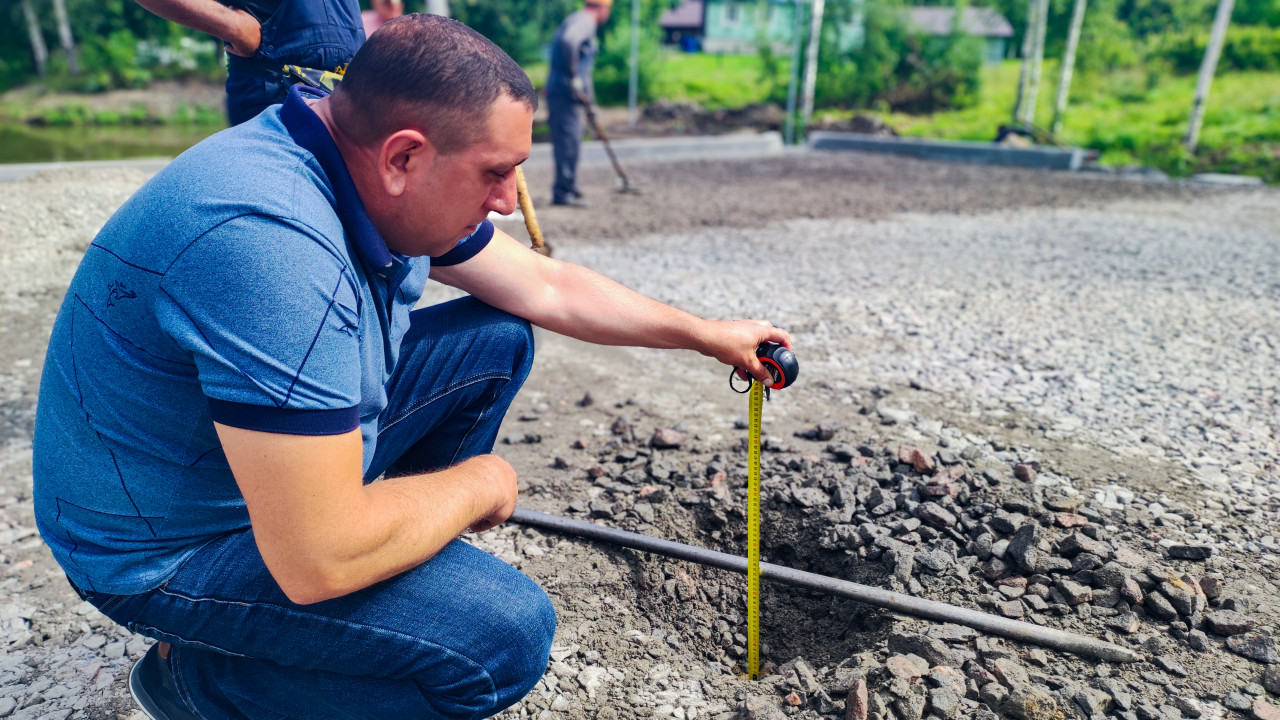 Фотография фиксирует процесс замера глубины слоя щебня на строительной площадке. Мужчина в синей рубашке и джинсах присел на корточки и удерживает рулетку, зафиксированную в углублении, где видно рыхлый гравий. На заднем плане рабочие продолжают распределение материала. Кадр иллюстрирует контроль качества и соответствия толщины подсыпки требованиям при строительстве дорог или площадок. Может использоваться в материалах о технадзоре, инженерных работах и благоустройстве.