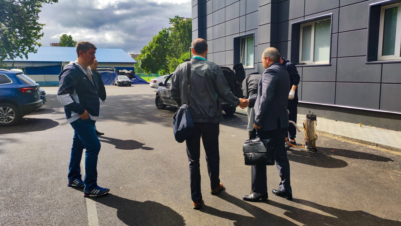 На снимке показана группа мужчин на площадке рядом с современным зданием с серой облицовкой. Двое специалистов обмениваются рукопожатием, остальные наблюдают за процессом проверки дорожного покрытия. На асфальте видны следы использования бурильного оборудования. На заднем плане находятся автомобили и хозяйственные постройки. Сцена отражает процесс взаимодействия инженеров и подрядчиков при контроле качества работ. Фотография подходит для статей о сотрудничестве в строительстве, техническом надзоре и взаимодействии заказчика и подрядчика.