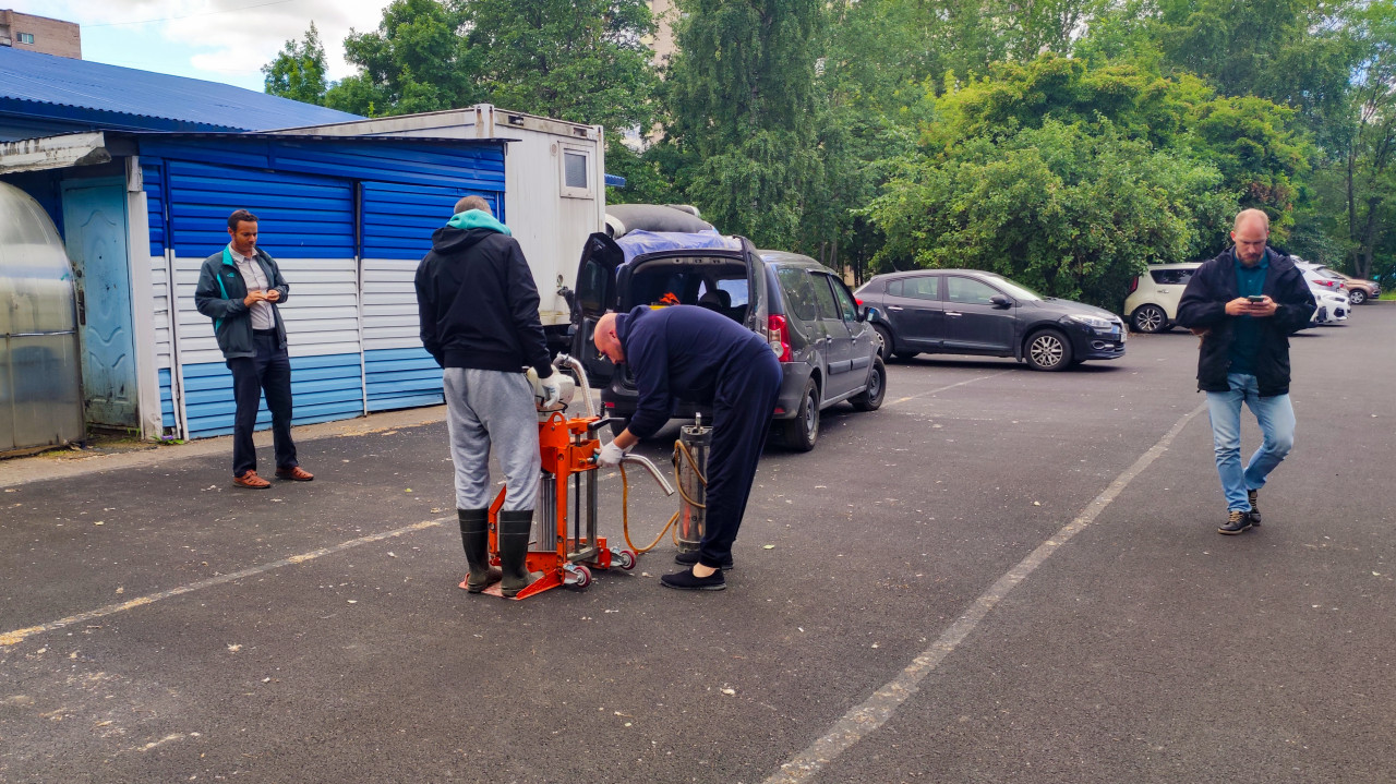 На фото изображены двое рабочих в спортивной одежде и перчатках, которые устанавливают бурильное оборудование на асфальтированной площадке. Рядом припаркованы автомобили, в том числе легковой универсал с открытым багажником, в котором лежат инструменты. На заднем плане видны гаражные строения с синими воротами и деревья. Снимок отражает процесс подготовки к отбору образцов асфальта и может быть использован в материалах о контроле качества дорожных работ и городском благоустройстве.