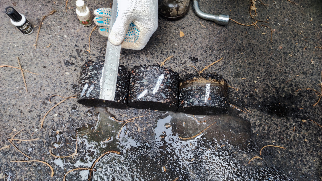 Фотография показывает три цилиндрических керна асфальта, извлеченных из дорожного покрытия. Рабочий в перчатке держит металлическую линейку для измерения толщины образцов. На асфальте заметны капли воды и инструменты, использованные для эксперимента. Снимок иллюстрирует процесс лабораторных замеров на месте и может применяться в материалах о контроле качества дорог и строительных технологиях.