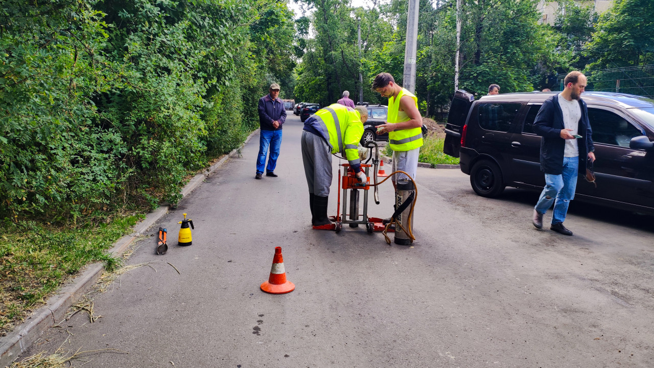 На снимке специалисты в сигнальных жилетах работают с буровой установкой, извлекая образцы асфальта с проезжей части. На переднем плане установлены дорожные конусы и оборудование, рядом стоят канистра и ручные инструменты. Вокруг находятся жители, наблюдающие за процессом. На заднем плане видны припаркованные автомобили и деревья. Фотография отражает процесс контроля качества дорожных работ и может быть использована в публикациях о благоустройстве территорий и проверке инфраструктуры.