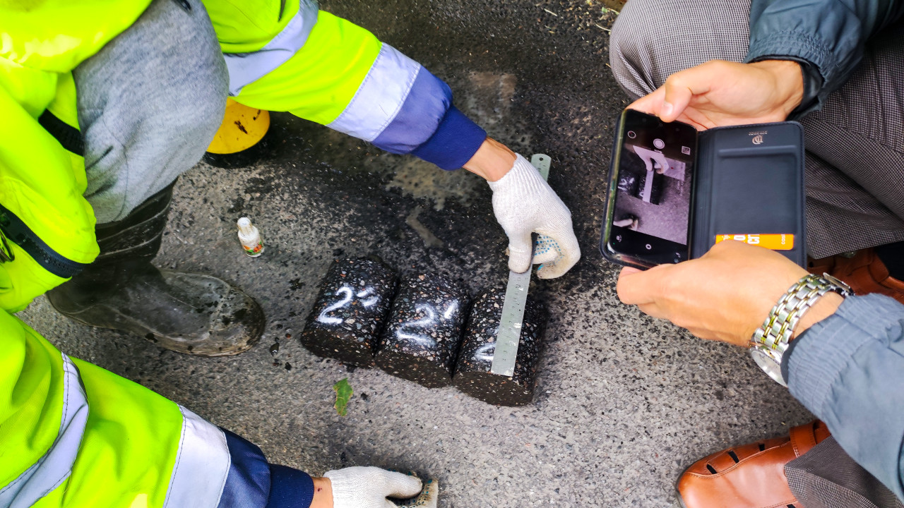 анализ асфальт асфальтобетон дорожное покрытие дорожные материалы дорожные работы дорожная поверхность забор образцов испытание испытания исследование качество контроль контроль качества образец образцы отбор образца отбор образцов отбор проб проба пробы проверка качества тест тестирование экспертиза керны замеры линейка пробы асфальта инженерные работы специалисты проверка дорог строительные технологии строительные материалы инженер техника лабораторные исследования ремонт дорог инфраструктура маркировка смартфон фотофиксация дорожные службы толщина покрытия испытания асфальта благоустройствоПохожие фотографии