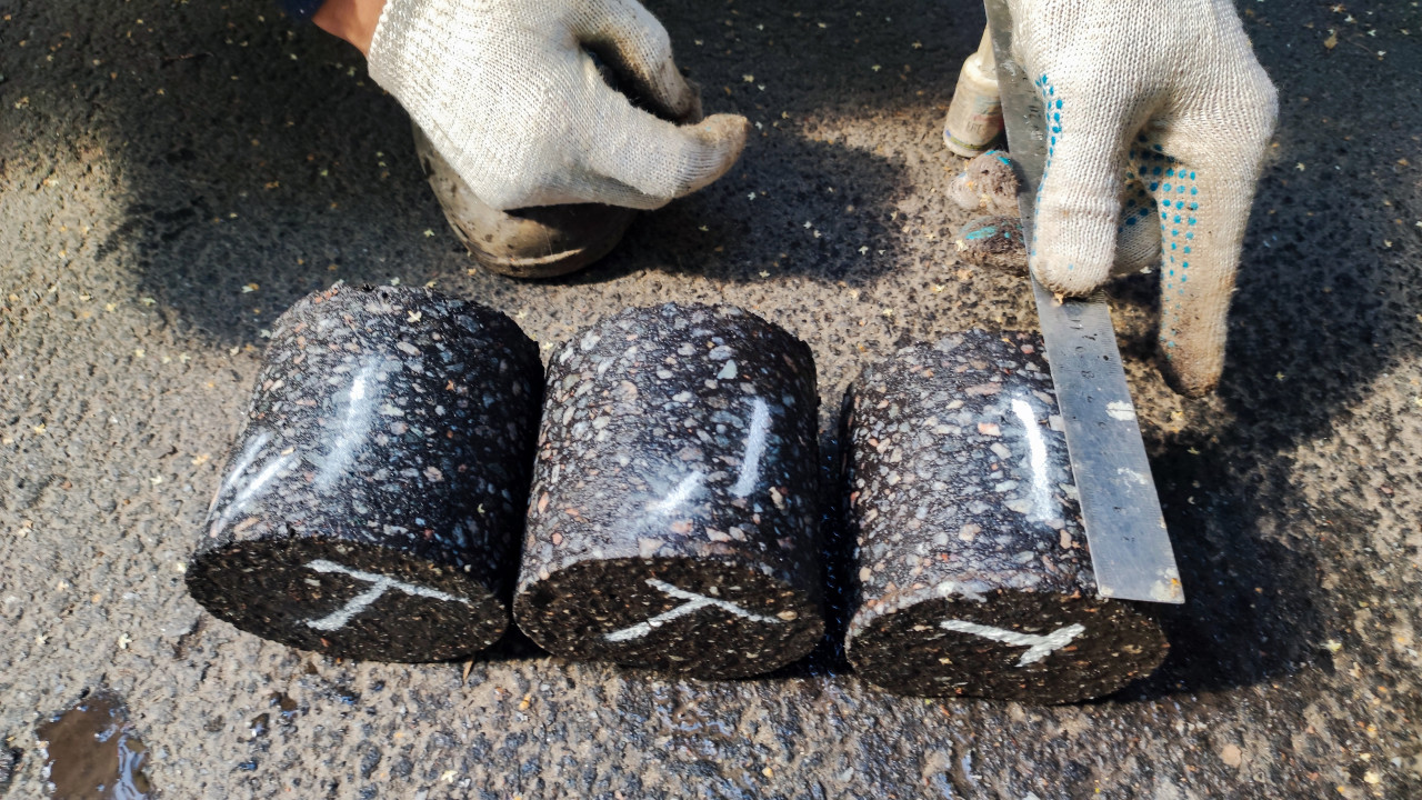 На фото показаны три цилиндрических керна асфальта, извлеченные из дорожного покрытия для контроля качества. Рабочий в защитных перчатках использует металлическую линейку для измерения толщины одного из образцов. Поверхность кернов влажная, видны характерные включения минерального наполнителя. Сцена зафиксирована на асфальтовом покрытии во время полевых испытаний. Снимок подходит для использования в материалах о дорожной экспертизе, строительстве и инженерных исследованиях.