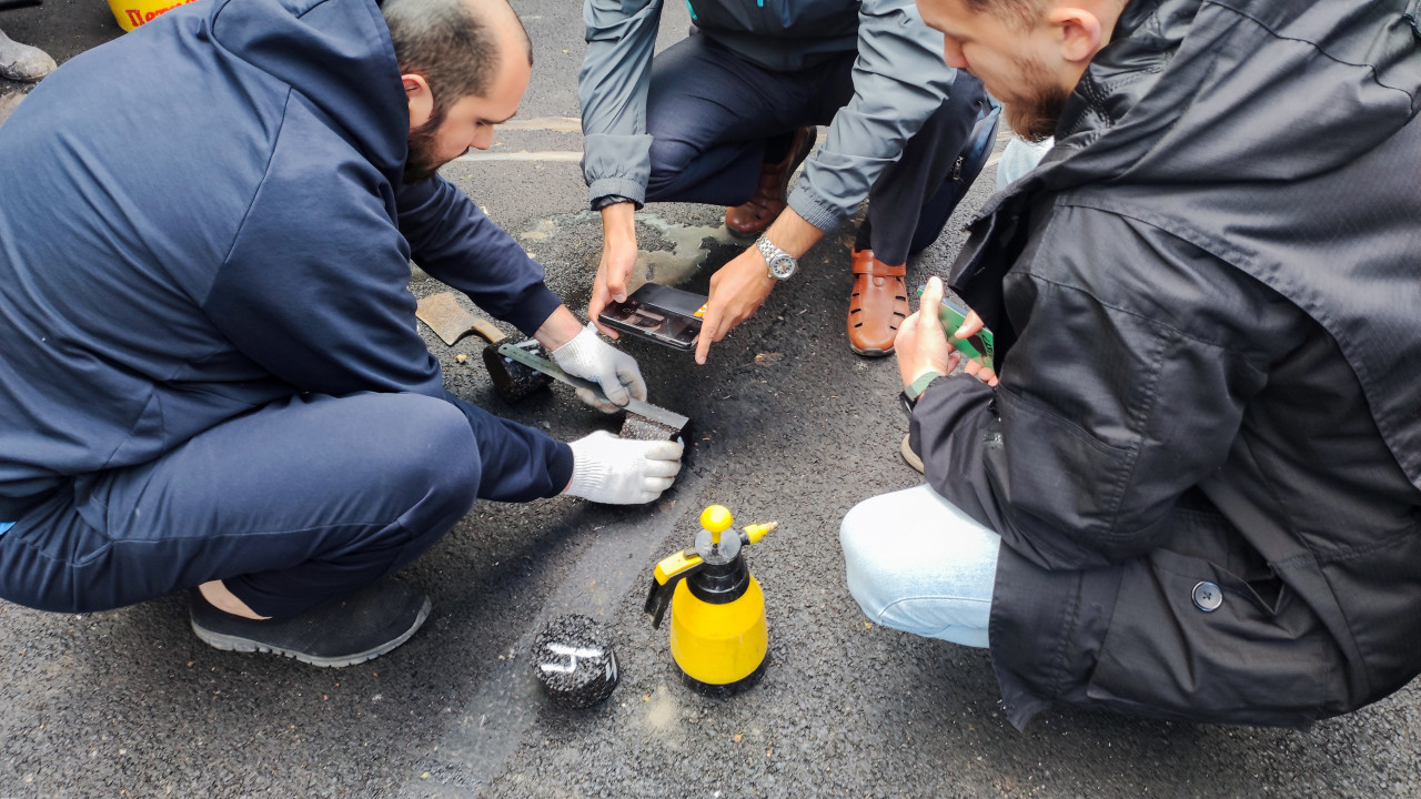 На снимке изображены трое мужчин, которые проводят замеры цилиндрического образца асфальта на асфальтированной площадке. Один специалист удерживает образец, другой измеряет линейкой, третий фиксирует процесс на смартфон. На переднем плане заметен жёлтый опрыскиватель, на асфальте видны следы влажной обработки и бурения. Сцена иллюстрирует контроль качества выполненных дорожных работ. Фотография подходит для использования в инженерных отчётах, учебных пособиях и материалах о строительстве.