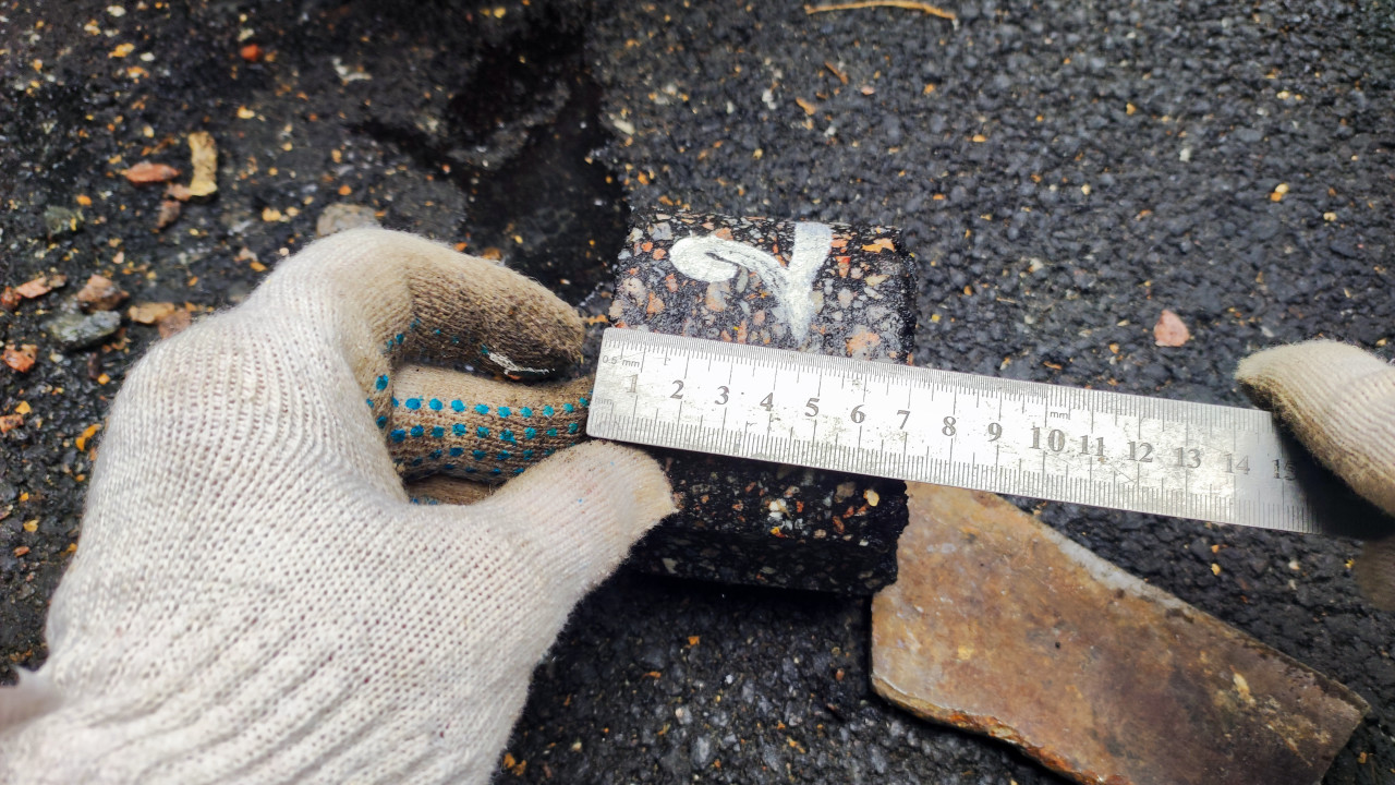 Руки в перчатках измеряют толщину асфальта металлической линейкой