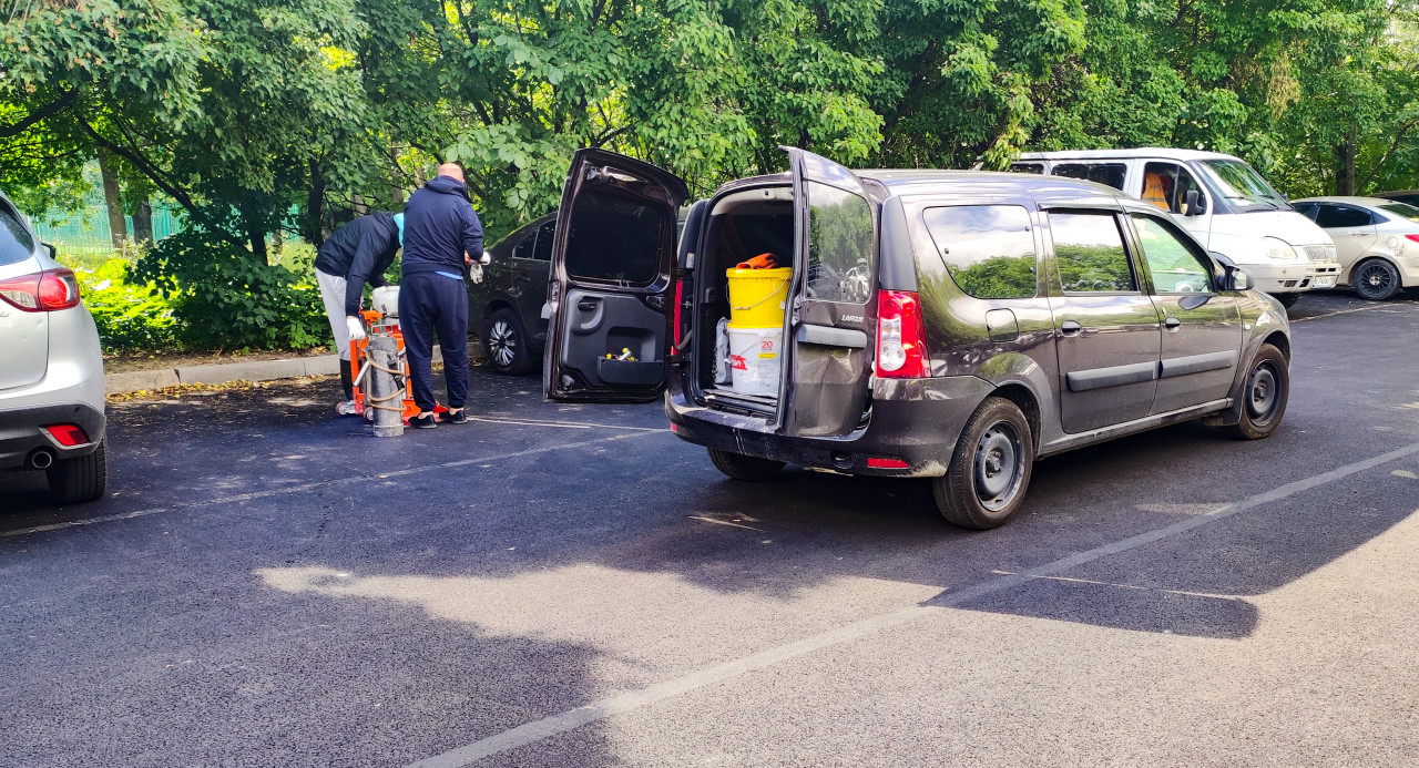 На фотографии двое рабочих устанавливают бурильное оборудование оранжевого цвета для отбора проб асфальта. Рядом припаркован автомобиль с открытым багажником, в котором находятся строительные материалы в жёлтых вёдрах. На заднем плане видны другие машины и зелёные деревья. Снимок отражает реальный процесс контроля качества дорожных работ и может быть использован в отчётных документах, публикациях о строительстве и инженерных материалах.