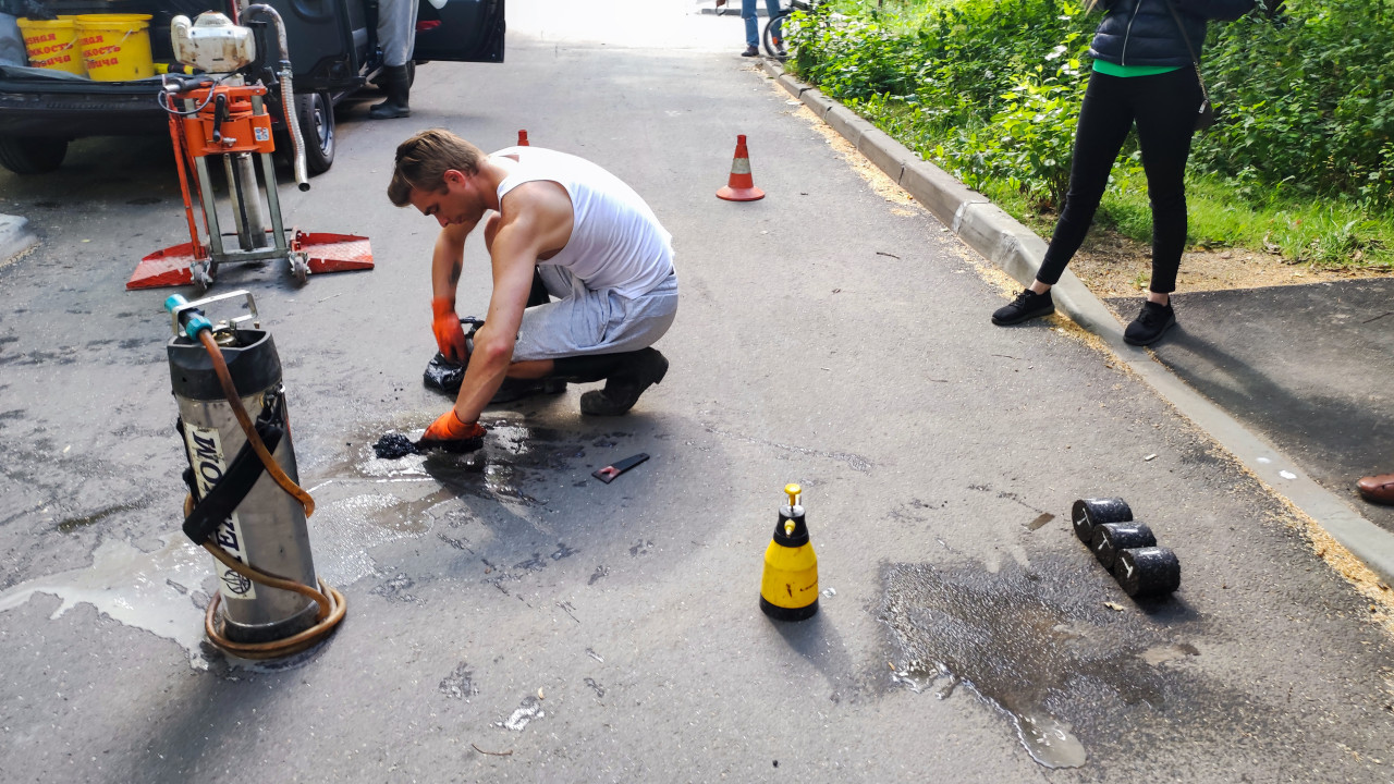 Фотография фиксирует момент подготовки извлеченных кернов асфальта: рабочий в перчатках промывает и очищает образцы водой на проезжей части. Рядом лежат цилиндры асфальта, оборудование для бурения и канистра. На заднем плане видны дорожные конусы и наблюдающие люди. Изображение иллюстрирует процесс полевого контроля качества дорожного покрытия и может применяться в статьях о строительных исследованиях и инженерии.