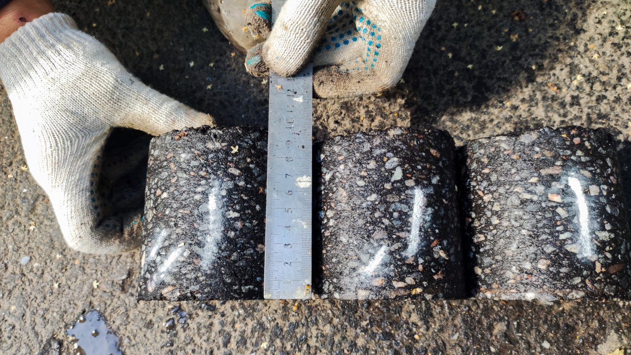На фото видны три цилиндрических керна асфальта, размещенные на асфальтовом покрытии, рядом рабочий измеряет их металлической линейкой. Поверхность образцов влажная, нанесены маркировки белой краской. Снимок отображает процесс дорожной экспертизы и контроль качества покрытия. Подобные изображения востребованы в профессиональных материалах о строительных технологиях, инженерных проверках и дорожной инфраструктуре.