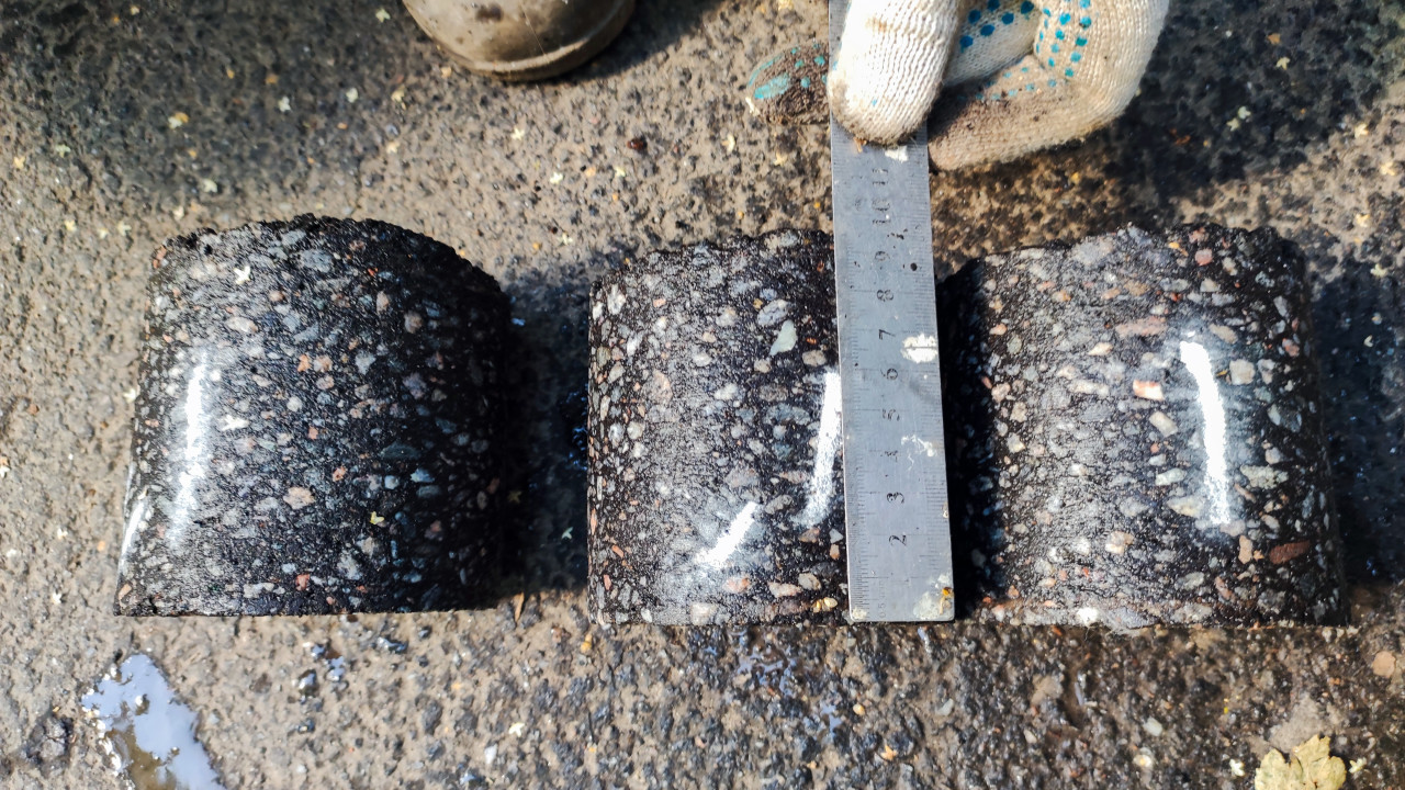 Изображение фиксирует процесс измерения образцов асфальта, извлеченных из покрытия. Рабочий в перчатке прикладывает металлическую линейку к одному из цилиндров. Керны пронумерованы белой краской, поверхность влажная, с четко видимой структурой щебеночного наполнителя. Фото иллюстрирует практику контроля качества дорог и используется для инженерных и строительных публикаций.