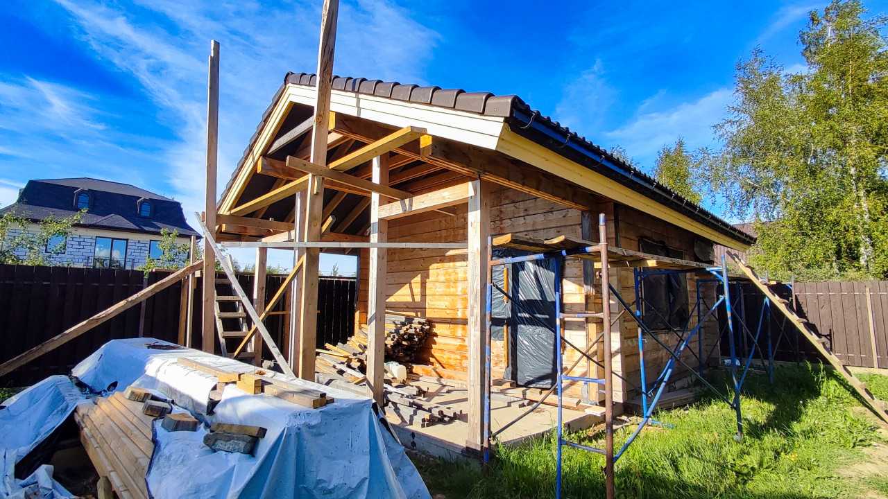 Деревянный дом на этапе монтажа крыши и внешней отделки