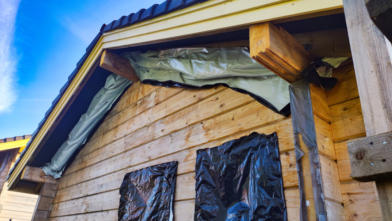 Снимок фиксирует деревянный фасад строящегося дома из бруса. Под свесом крыши уложена защитная пленка, частично закрепленная на стропилах. Видны массивные балки, выступающие за пределы стены, и временные заглушки на оконных проемах из черного материала. Конструкция находится на стадии строительства, детали кровли и отделки еще не завершены. Фото может использоваться в статьях о строительных этапах, монтаже деревянных домов, защите фасада и подготовке здания к отделке.