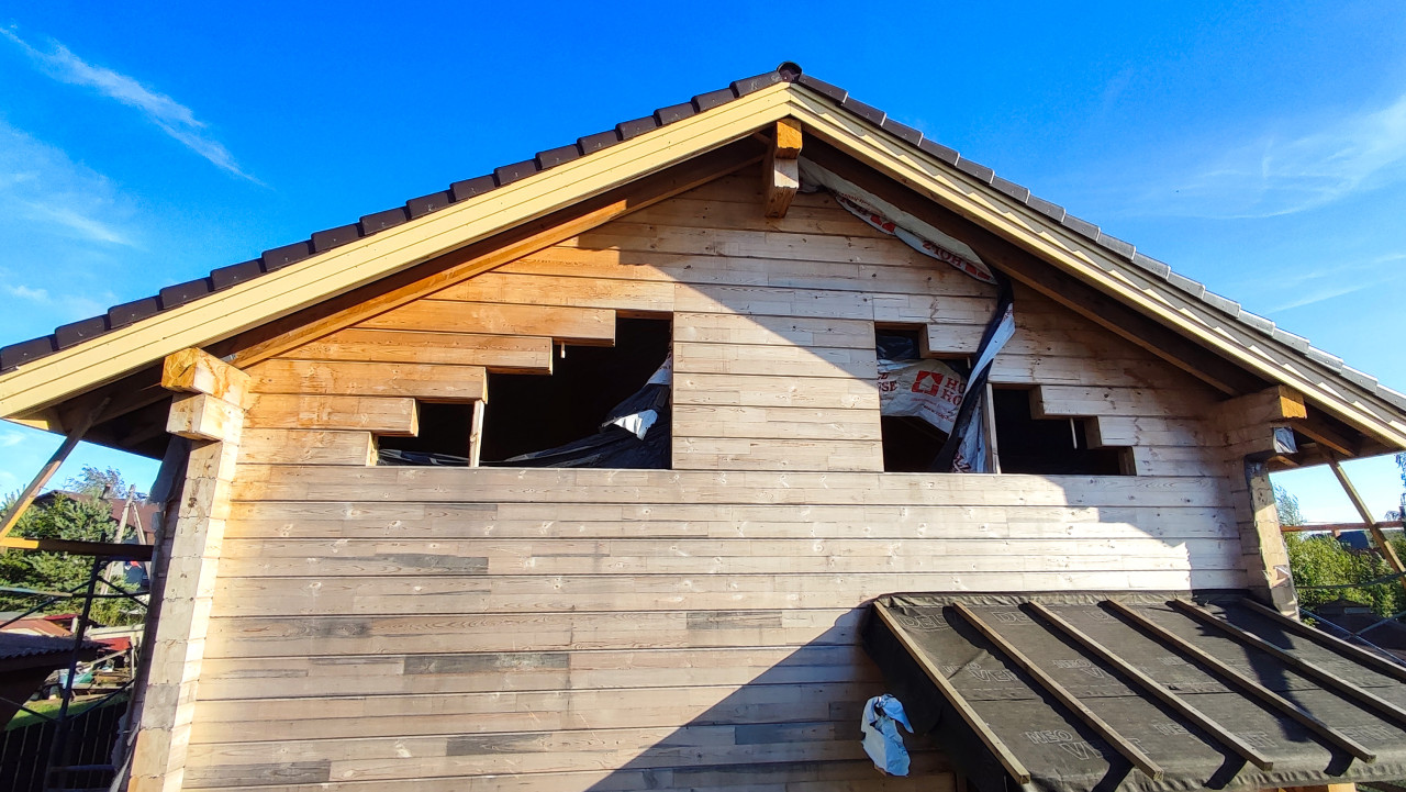 На фотографии показан фронтон деревянного дома в процессе строительства. Стена выполнена из бруса, в ней имеются несколько прямоугольных проемов под окна, которые пока не застеклены. Крыша покрыта черепицей, часть конструкций закрыта строительной пленкой. В нижней части кадра видна часть пристройки с черным гидроизоляционным покрытием. Съемка сделана на фоне яркого неба и зелени участка.