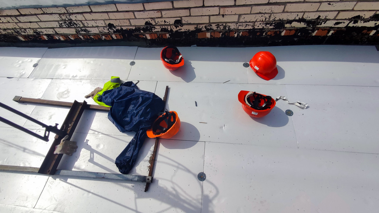На фото изображена часть крыши, покрытая новым белым материалом, на которой лежат несколько красных строительных касок, защитная одежда и перчатка. На заднем плане виден кирпичный парапет с остатками битумного покрытия. Снимок отражает тему охраны труда и организации рабочего процесса на строительной площадке, может использоваться в материалах о безопасности и строительных работах.