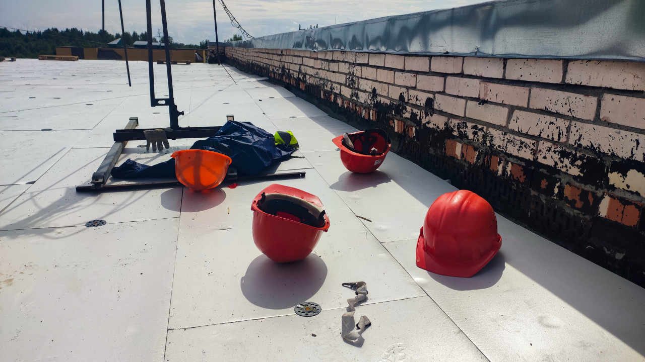 На фото изображены несколько строительных касок красного цвета, расположенных на плоской крыше здания рядом с кирпичным парапетом. Рядом с касками находятся элементы спецодежды и строительные инструменты. Поверхность крыши покрыта новым материалом, закреплённым крепежами. Снимок иллюстрирует тему строительных работ, организации труда и соблюдения техники безопасности. Изображение подходит для использования в публикациях, посвящённых строительству, безопасности и рабочему процессу.