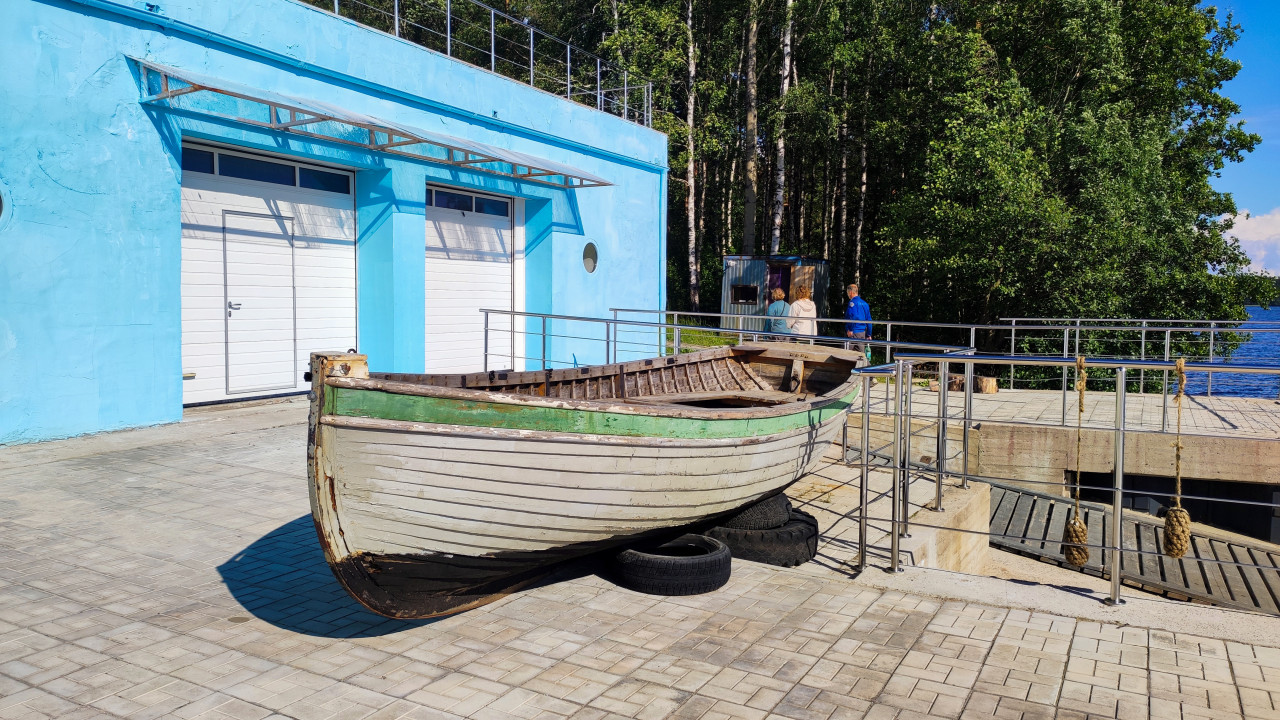 лодка водный транспорт плавсредства старая лодка деревянная лодка озеро берег здание голубая стена ворота площадка плитка металл ограждение природа деревья туризм история транспорт музейная экспозиция восстановление лодок сохранение прибрежная зона инфраструктура лето база отдыхаПохожие фотографии