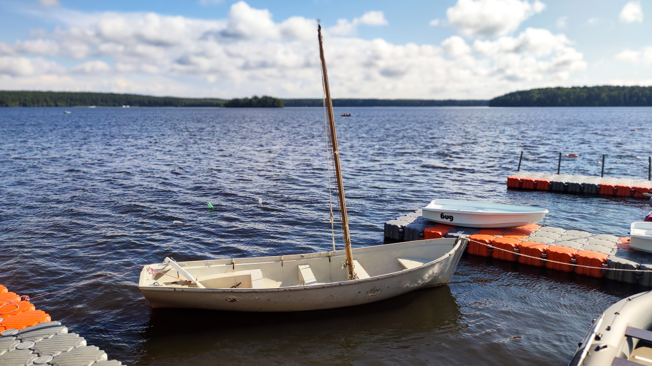 На фото изображена небольшая деревянная лодка с мачтой, пришвартованная к модульному понтону из пластиковых блоков серого и оранжевого цвета. Судно стоит у берега озера, поверхность воды покрыта лёгкими волнами. На заднем плане виден лесной массив и несколько лодок вдали. Рядом на понтоне находится белый катамаран. Снимок можно использовать для материалов о водных прогулках, рыбалке, туризме и прибрежной инфраструктуре.