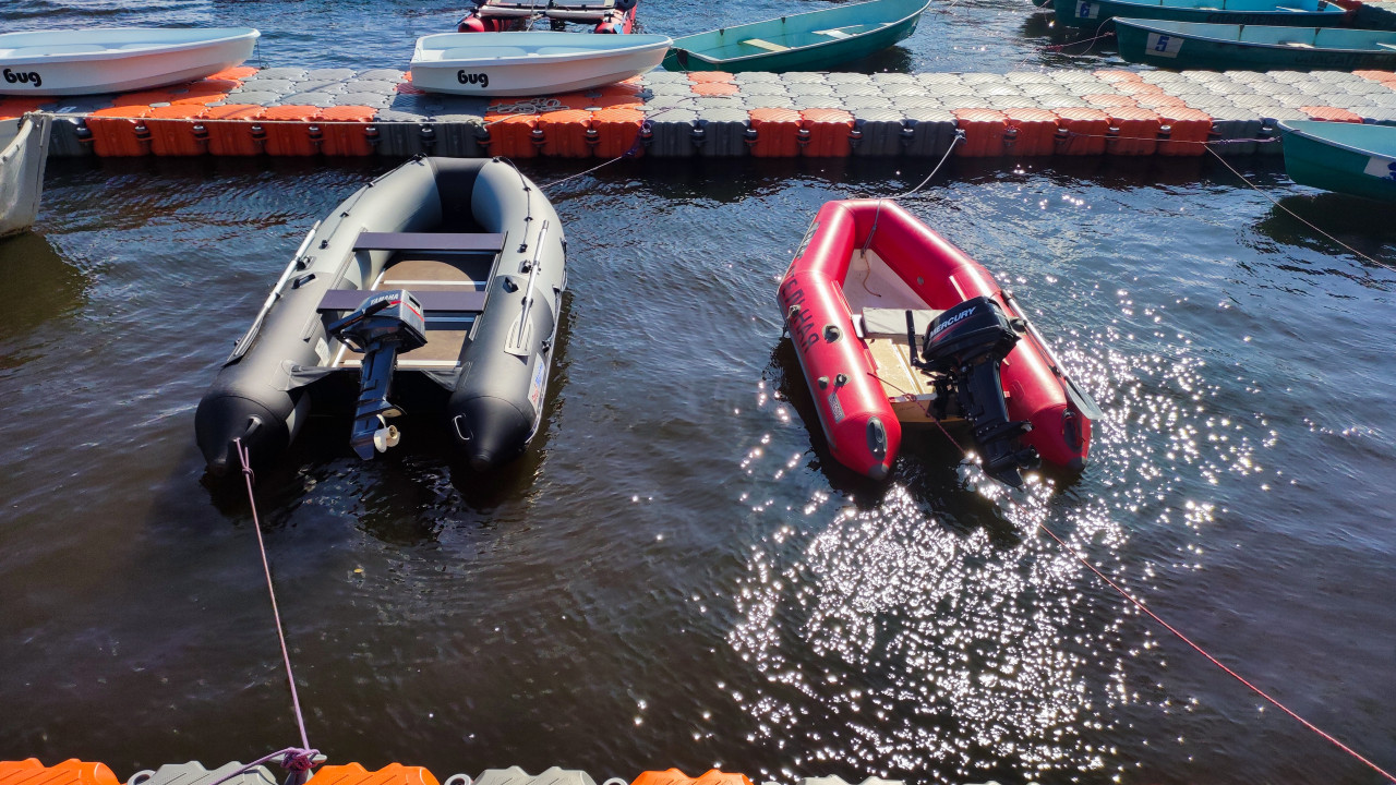 Снимок показывает две надувные моторные лодки, пришвартованные к понтонному причалу. Одна лодка красного цвета с мотором марки Mercury, другая — тёмно-серого цвета с мотором Yamaha. За ними видны пластиковые понтоны и другие пришвартованные лодки. Вода озера играет бликами на солнце, подчёркивая атмосферу летнего дня. На горизонте виден лес. Фотография может использоваться в материалах о рыбалке, аренде лодок, водном спорте, активном отдыхе и туризме.