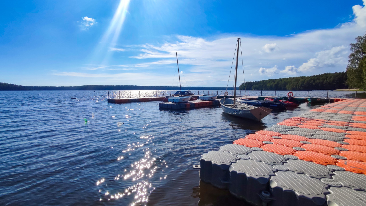 На фото изображён понтон из модульных блоков серого и оранжевого цветов, к которому пришвартованы различные лодки, включая деревянную с мачтой, белые катамараны и моторные лодки. На горизонте видны лесистые берега, отражающиеся в воде. Солнечные лучи создают яркие блики на поверхности озера. Снимок отражает атмосферу летнего отдыха у воды и может использоваться для иллюстраций о водных прогулках, туризме и прокате лодок.