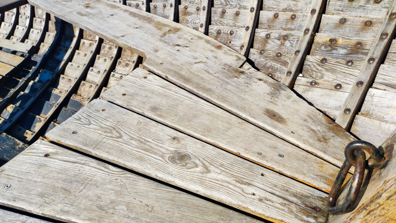 На фото крупным планом изображены деревянные доски настила старой лодки и часть её борта с металлическими заклёпками. В кадре также виден массивный железный рым, служивший для крепления каната. Поверхность дерева имеет следы времени и эксплуатации, что подчёркивает возраст конструкции. Снимок может быть полезен для учебных материалов о судостроении, истории водного транспорта и реставрационных проектах.