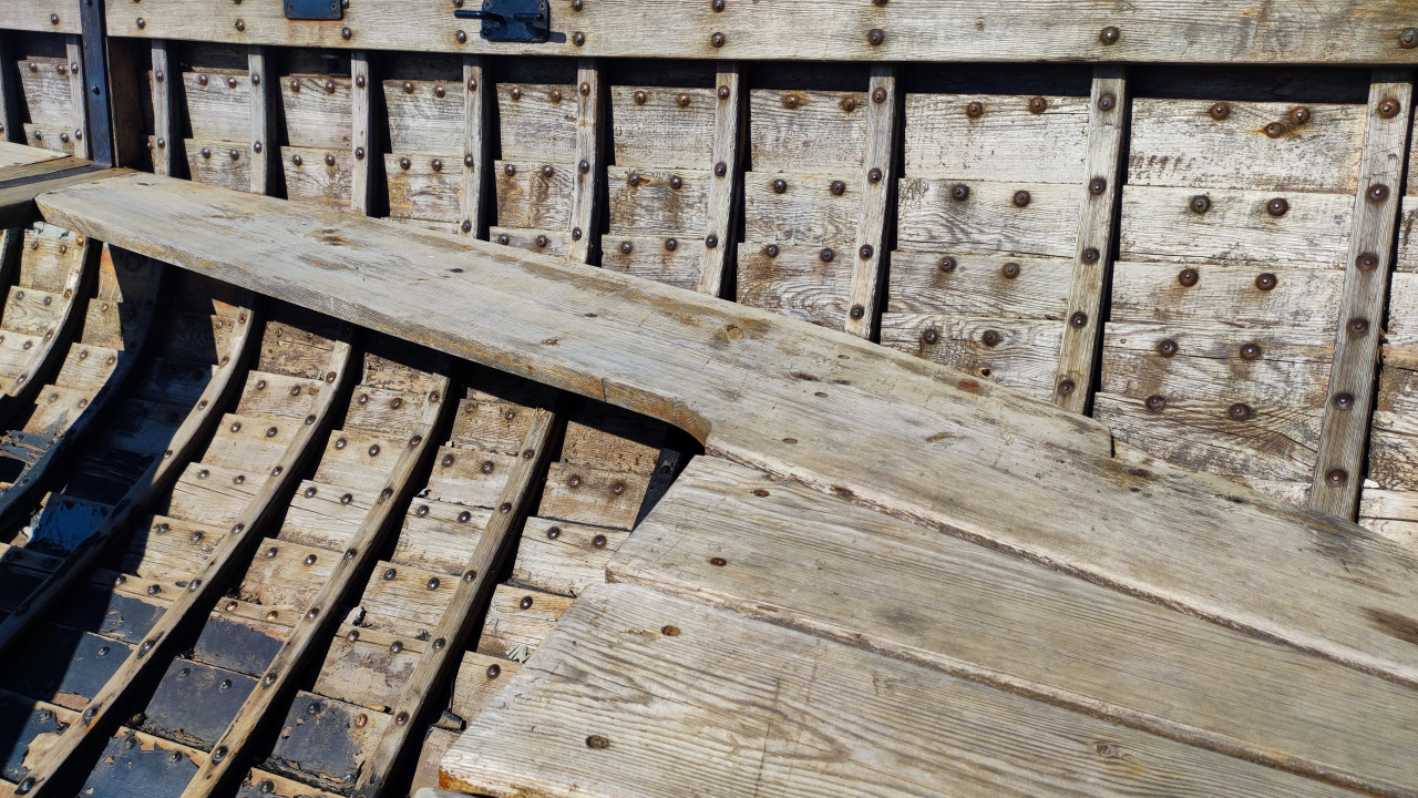 Снимок демонстрирует бортовую часть деревянной лодки с характерными металлическими заклёпками, укрепляющими корпус. В кадре видна длинная деревянная скамья и часть настила. Детали конструкции указывают на традиционный метод постройки судов. На заднем плане можно заметить элементы плиточного покрытия и металлических перил. Фотография подходит для материалов о судостроении, традиционных ремёслах и истории водного транспорта.