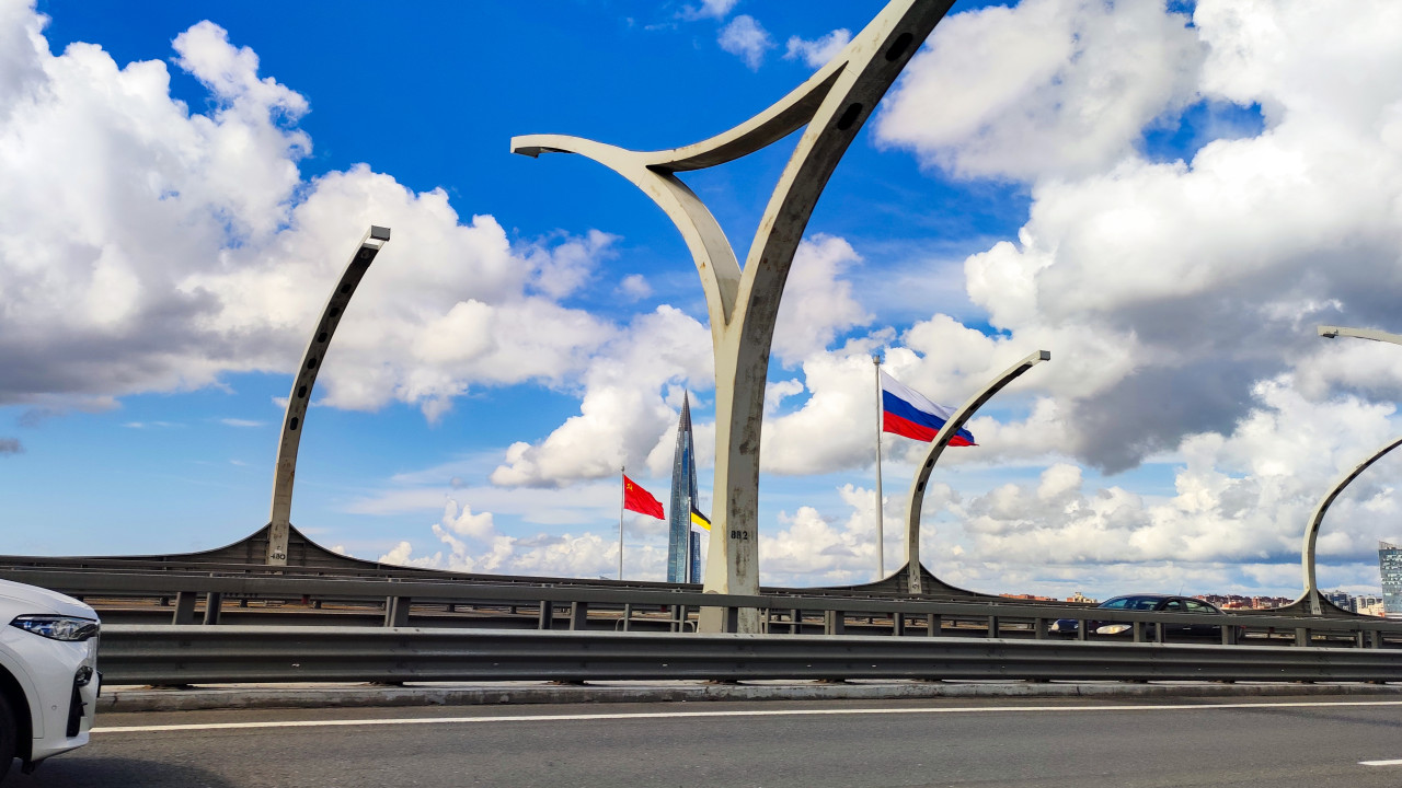 На фото видна часть Западного скоростного диаметра Санкт-Петербурга, с дугообразными металлическими конструкциями вдоль трассы. В кадре развеваются флаги России и Германии, а также заметен шпиль Лахта-центра на фоне облачного неба. Башня, построенная в 2010-х годах, является самым высоким зданием России и Европы. Фотография фиксирует сочетание транспортной магистрали и знаковых символов, что делает её подходящей для использования в СМИ, блогах и иллюстрациях о Петербурге.