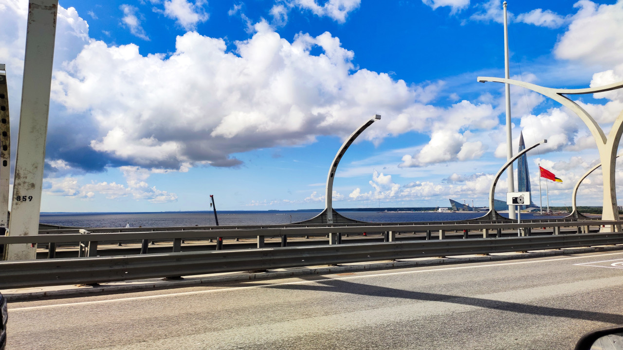 дорога транспорт автомобили движение город инфраструктура Санкт Петербург Россия Лахта центр Западный скоростной диаметр ЗСД Финский залив современная архитектура небоскреб Газпром высотное здание башня деловой центр магистраль проезжая часть мост акватория панорама горизонт облака небо транспортная система городской пейзаж архитектурный объектПохожие фотографии