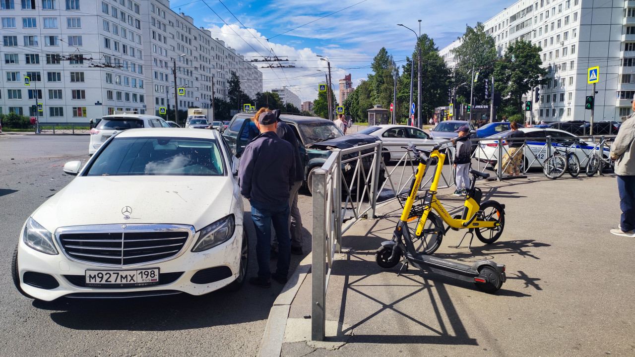 На изображении запечатлен белый Mercedes с вмятинами и черный внедорожник с сильными повреждениями после столкновения на перекрестке. Водители и свидетели происшествия находятся рядом, обсуждая ситуацию. На заднем плане заметны жилые многоэтажные дома, пешеходы, а также полицейский автомобиль, фиксирующий происшествие. На переднем плане стоят прокатные электросамокаты. Снимок отражает последствия дорожной аварии в условиях современного города.