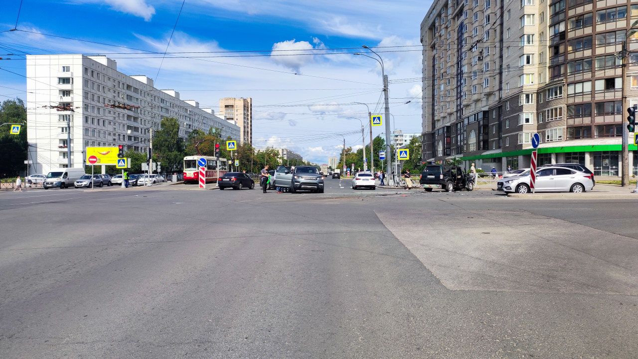 На фото изображен крупный городской перекресток, где заметны последствия дорожно-транспортного происшествия. В центре кадра стоят поврежденные внедорожники, вокруг которых собрались люди. На заднем плане виден трамвай, движущийся по маршруту, жилые дома типовой постройки и дорожные знаки. Сцена снята при ясной погоде, что позволяет отчетливо рассмотреть детали. Изображение может использоваться для иллюстрации тем, связанных с безопасностью дорожного движения и происшествиями в городской среде.