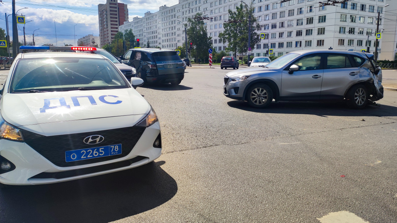 На снимке запечатлен автомобиль ГИБДД и серебристая Mazda CX-5, получившая повреждения в результате ДТП на перекрестке Санкт-Петербурга. Машины расположены на проезжей части, на фоне заметен темно-зеленый внедорожник и другие транспортные средства. В кадре также видны многоэтажные жилые дома и элементы городской инфраструктуры. Присутствие полиции указывает на оформление происшествия. Снимок можно использовать в материалах о дорожной безопасности, работе правоохранительных органов и авариях на городских дорогах.