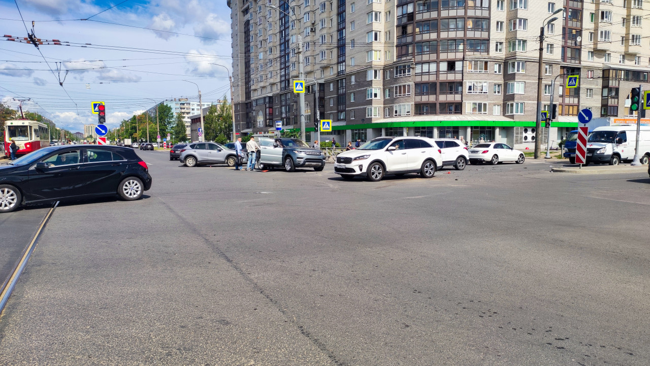 На фото запечатлен городской перекресток, где произошла авария с участием нескольких автомобилей. В центре стоит серебристый внедорожник, рядом люди осматривают повреждения. По краям кадра видны другие машины, в том числе белые кроссоверы, а также многоэтажные жилые дома. На заднем плане — красно-белый трамвай, движущийся по маршруту. Сцена фиксирует последствия дорожного происшествия и может быть использована для новостных публикаций о ДТП и вопросах безопасности на дорогах.