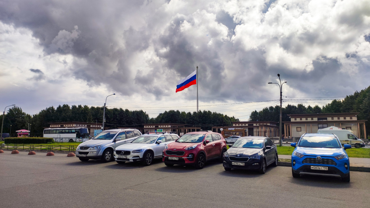 Парковка автомобилей и российский флаг на фоне облачного неба