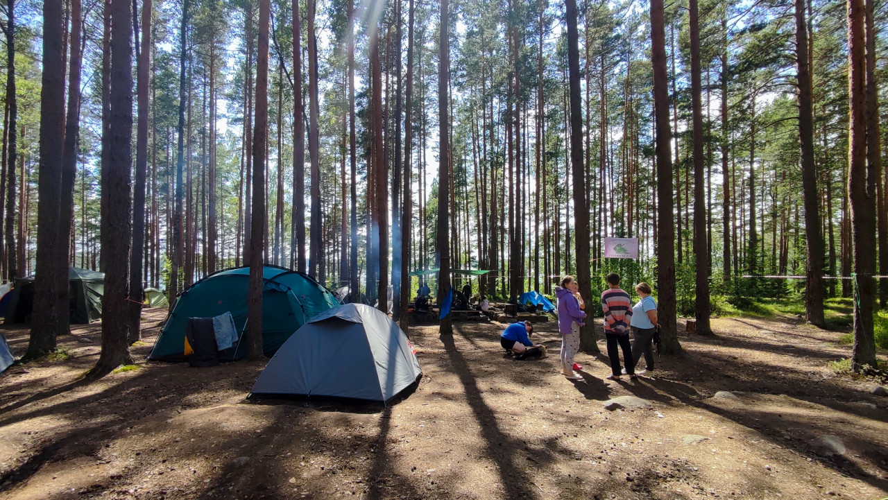 На фотографии изображен палаточный лагерь, расположенный среди высоких сосен. В кадре установлены несколько палаток разных размеров, а также тенты, натянутые для общей зоны. Люди общаются, отдыхают и занимаются делами. На одном из деревьев закреплен флаг с символикой. Свет пробивается сквозь деревья, создавая длинные тени. Фото отражает атмосферу коллективного отдыха на природе. Культурно-исторических объектов в кадре нет. Снимок может быть использован для иллюстраций о кемпинге, туристических лагерях, молодежных слётах и экологическом туризме.