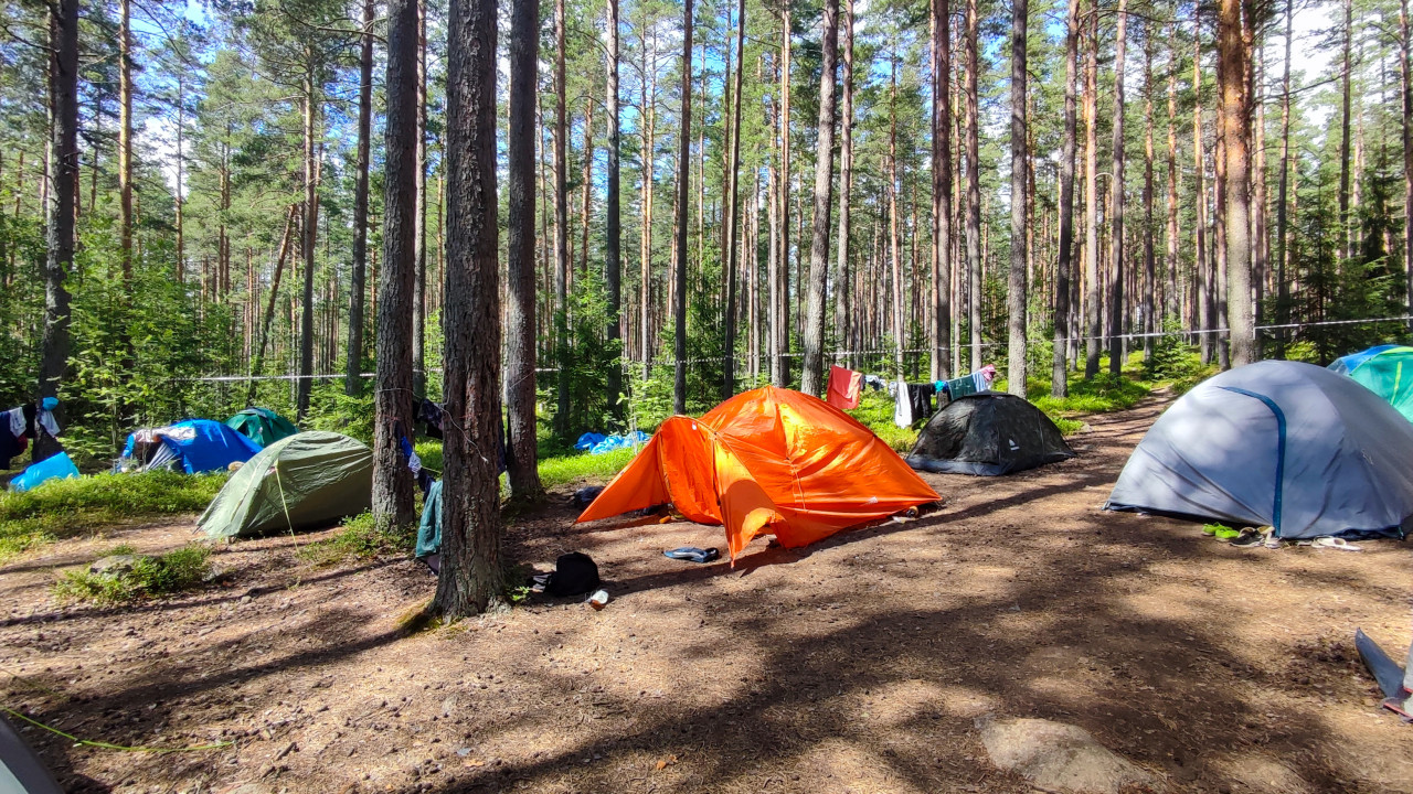 На фото запечатлен палаточный лагерь, где на переднем плане видны яркая оранжевая и серая палатки. Вдоль деревьев натянуты веревки с сушащейся одеждой и снаряжением. На заднем плане заметны другие палатки и густая растительность леса. Высокие сосны создают ощущение защищенности и уюта. В кадре нет культурных или архитектурных объектов. Снимок может быть использован для статей и иллюстраций на тему кемпинга, походов, молодежных лагерей и отдыха на природе.