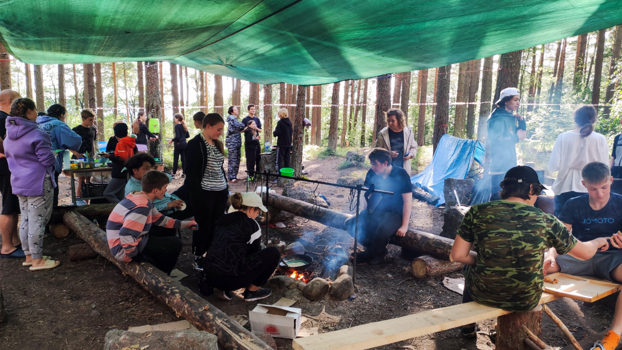 На фото изображена группа людей в лесном лагере, готовящих еду на костре под зелёным тентом. Огонь разложен в окружении камней, над ним закреплён металлический держатель для подвешивания посуды. На переднем плане видны скамейки из брёвен и досок, а на заднем — палатки и деревья. Снимок отражает элементы походной жизни и может быть использован для статей о туризме, выездных лагерях и отдыхе на природе.