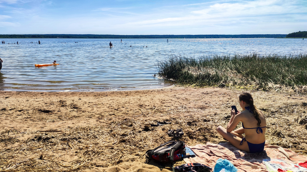 На фото изображена девушка в синем купальнике, сидящая на покрывале у кромки воды, с телефоном в руках. На песчаном пляже заметны сумка, обувь и вещи, в воде купаются люди, на надувном оранжевом матрасе плывёт ребёнок. Справа видны прибрежные заросли камыша. Съёмка проведена днём при солнечной погоде, горизонт закрывает лесной массив. Сцена типична для летнего отдыха у пресноводного озера, без культурно-исторических объектов. Изображение может использоваться в материалах о туризме, отдыхе, летнем досуге и пляжной инфраструктуре.