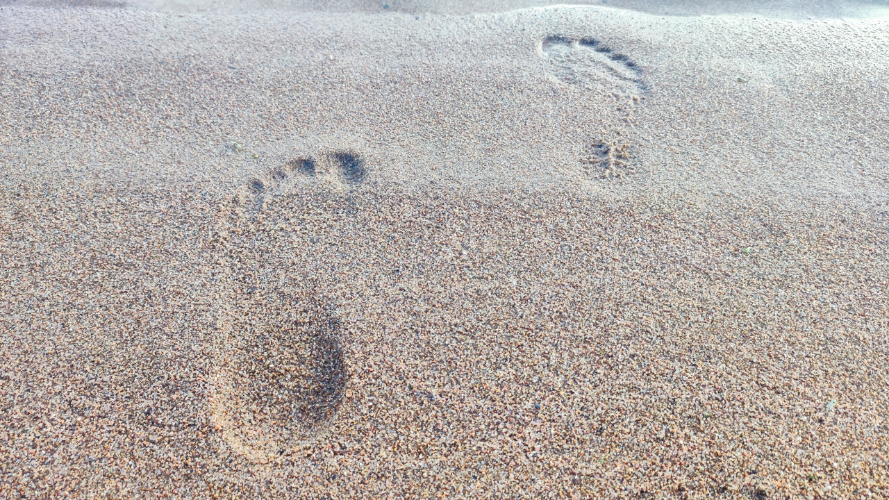 Следы босых ног на песке у кромки воды
