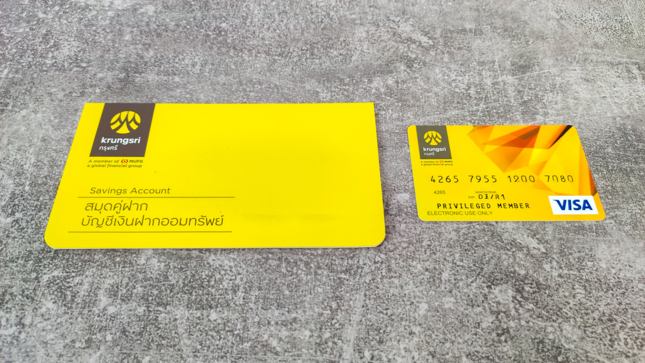 На снимке показана банковская карта Visa и сберегательная книжка тайского банка Krungsri жёлтого цвета. Объекты разложены на серой поверхности. Фотография может использоваться в публикациях о банковских услугах, депозитных счетах и современных средствах безналичных расчётов.
