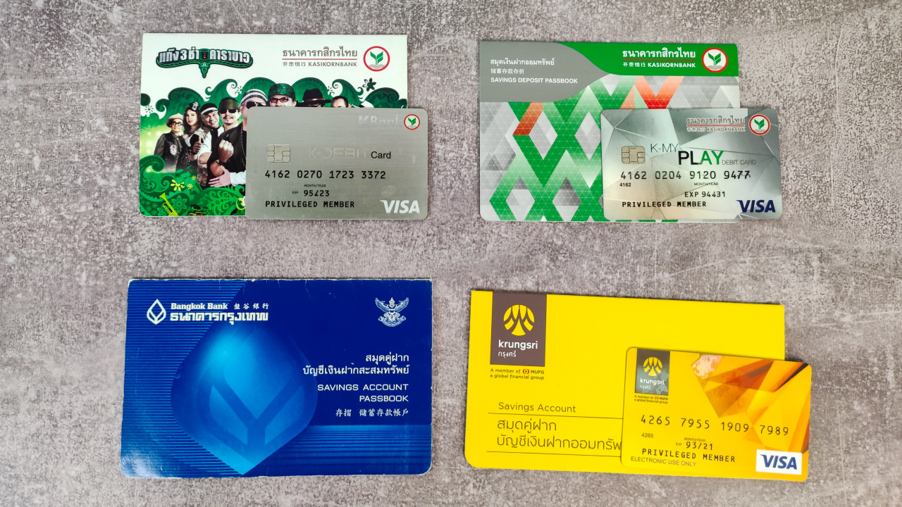 На фотографии изображены банковские карты Visa и сберегательные книжки от тайских банков Kasikornbank, Bangkok Bank и Krungsri. Карты расположены рядом с книжками: зелёная, синяя и жёлтая, видны надписи на тайском и английском языках. Сцена демонстрирует разнообразие банковских инструментов и может использоваться в материалах о финансовых услугах, депозитах и международных расчётах в Таиланде.
