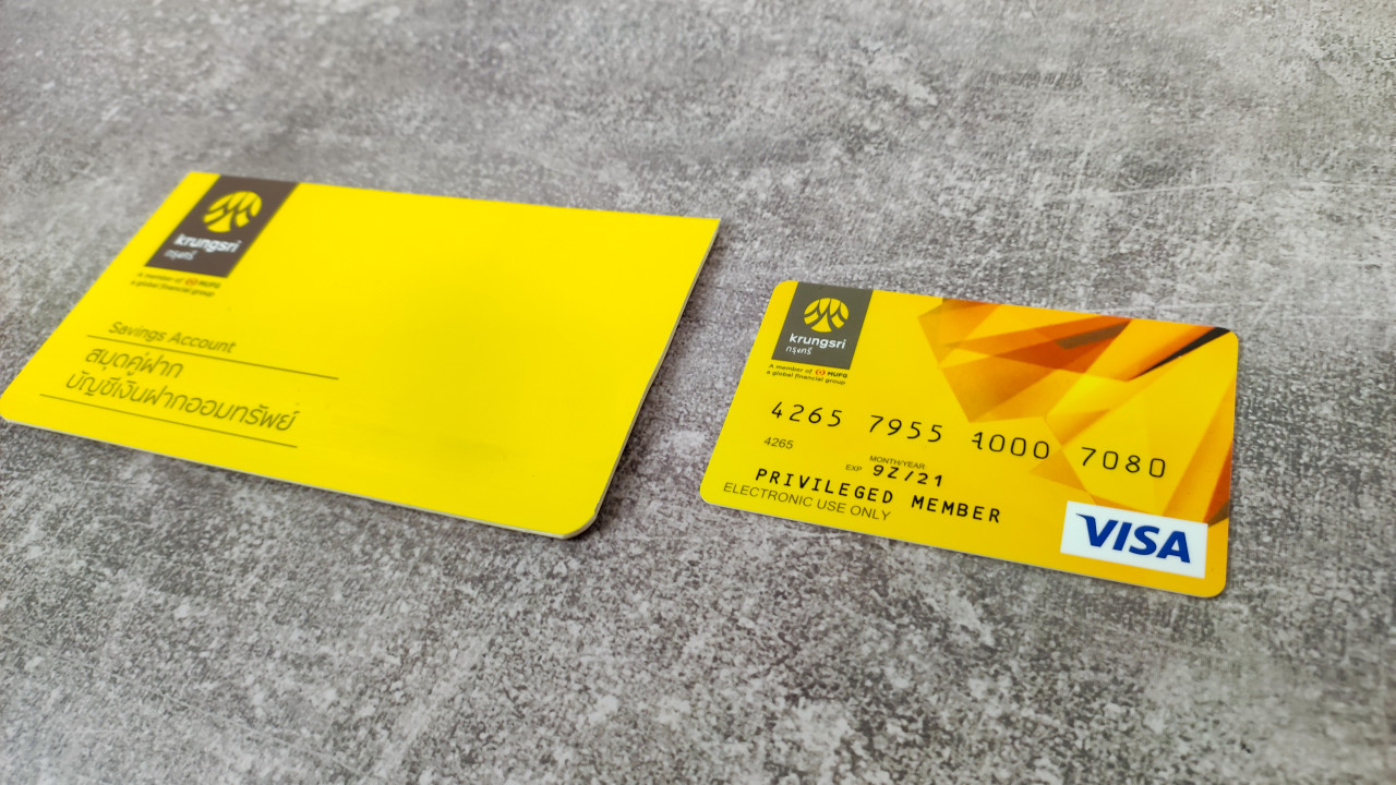 На фотографии изображена жёлтая банковская карта Visa с надписью «Privileged Member» и сберегательная книжка тайского банка Krungsri. Карта расположена справа от книжки, объекты лежат на серой поверхности. Снимок можно использовать в публикациях о финансовых инструментах, депозитных услугах и работе банков в Юго-Восточной Азии.