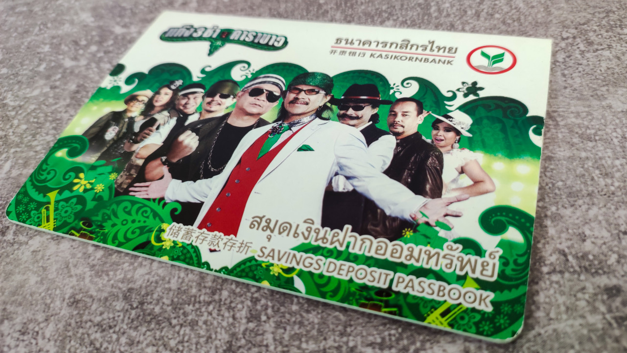 На фото изображена сберегательная книжка Kasikornbank, обложка которой украшена изображением музыкальной группы и зеленым графическим оформлением. На обложке присутствуют надписи на тайском, китайском и английском языках, а также логотип банка. Книжка используется для учета операций по депозитному счету и отражает маркетинговые инициативы банка, ориентированные на молодежную аудиторию. Снимок может применяться в публикациях о финансовых продуктах, банковских акциях и культурных коллаборациях в Таиланде.