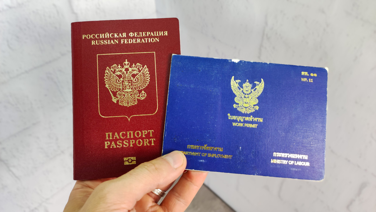 Заграничный паспорт Российской Федерации и рабочее разрешение Таиланда в руке
