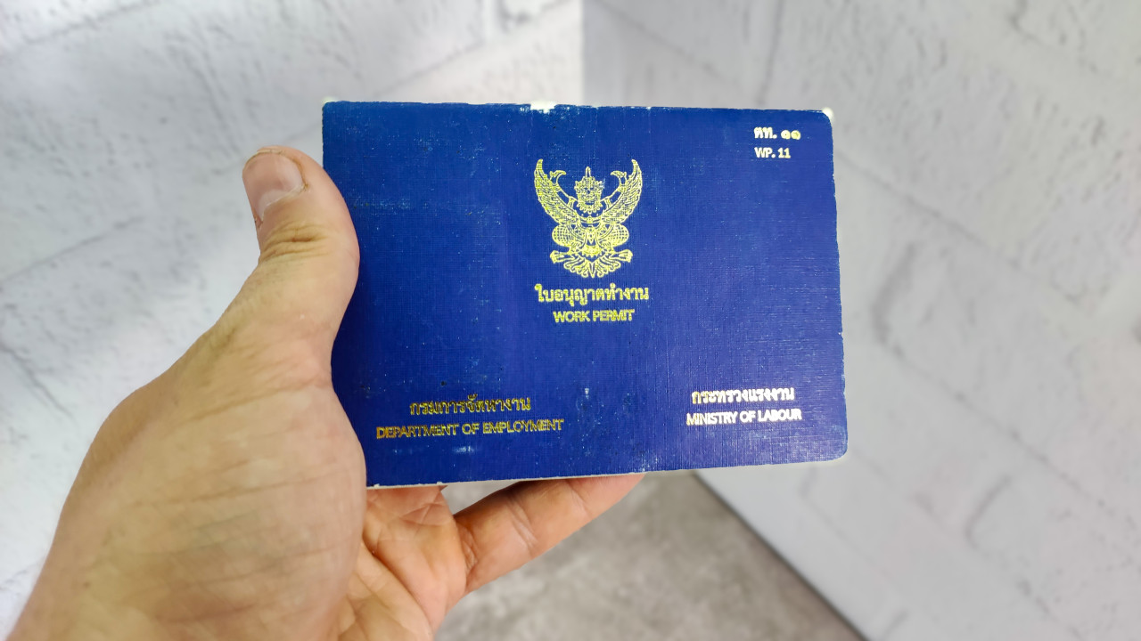 На снимке изображён тайский рабочий пермит в синей обложке, который человек держит в руке. На обложке золотым тиснением изображён государственный герб Гаруды и надписи «WORK PERMIT», «Department of Employment», «Ministry of Labour». Такой документ играет важную роль для легализации трудовой деятельности иностранцев в стране и является обязательным для работы в Таиланде. Снимок отражает практический контекст использования документа, когда он предъявляется для проверки или оформления. Изображение может использоваться в иллюстрациях к материалам о визах, трудовом праве и миграционных процедурах.